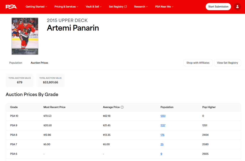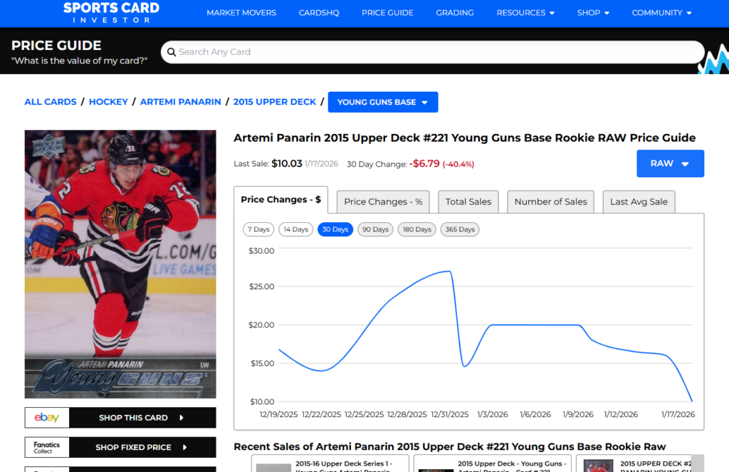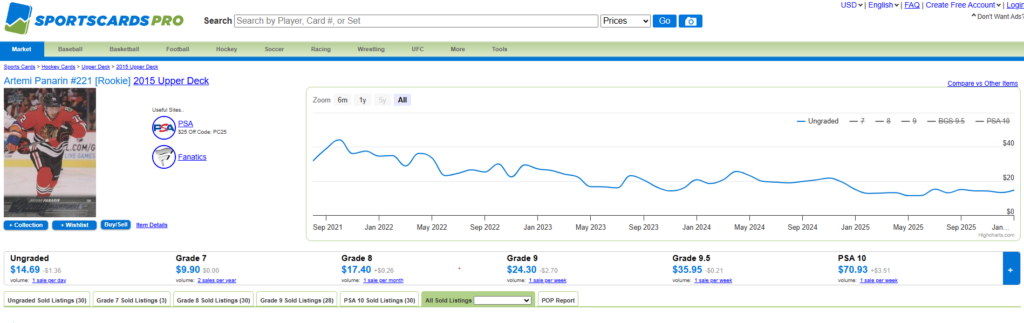 Sport Cards Pro -sivustolla löytyy myös historiallista dataa, eli sieltä näkee myös trendiä. Panarinin Young Guns -sivulta näemmä, että miehen trendi on ollut laskeva, PSA 10 on täälläkin n. 70$:n haarukassa.