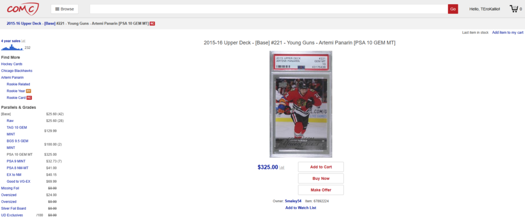 Mutta mitä sitten, jos myynnissä ei ole kuin yksittäinen korttia. Jatketaan Panarinin Young Gunsilla eteenpäin. COMC:ssa on myynnissä yksi Panarinin PSA:n 10 saanut kortti. Hinta on 325$, onko tämä siis hyvä hinta vai ei?