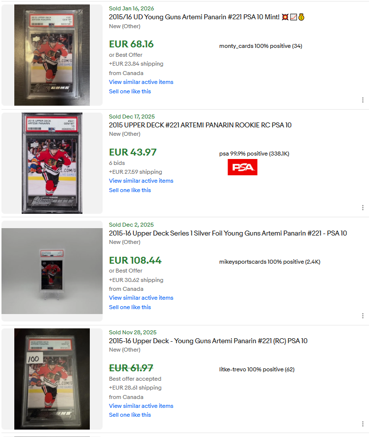 Kaivellaanpa siis vähän lisää internettiä. Mennään ensiksi eBay:hin. Haetaan tuota PSA 10:ä hakusanoilla ”2015-16 #221 Artemi Panarin Young Guns PSA 10”. Listan kärkeen nousi heti kaksi kappaletta n. 70€:n pyyntihinnalla.